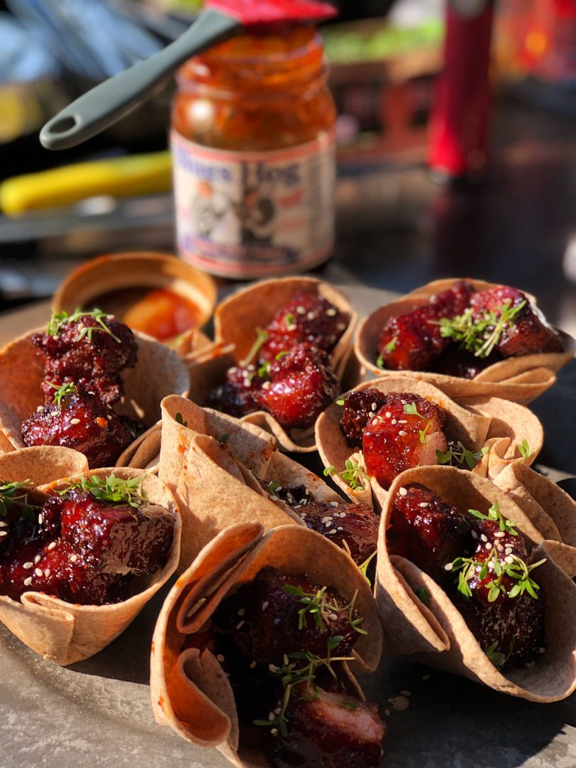 1,5 kg buikspek (zonder zwoerd) Braairub no2 Appelsap Appelazijn 4 eetlepels basterdsuiker 2 eetlepels honing Ongezouten roomboter Blues Hog Original BBQ saus 12 tortilla’s Tuinkers Sesamzaad